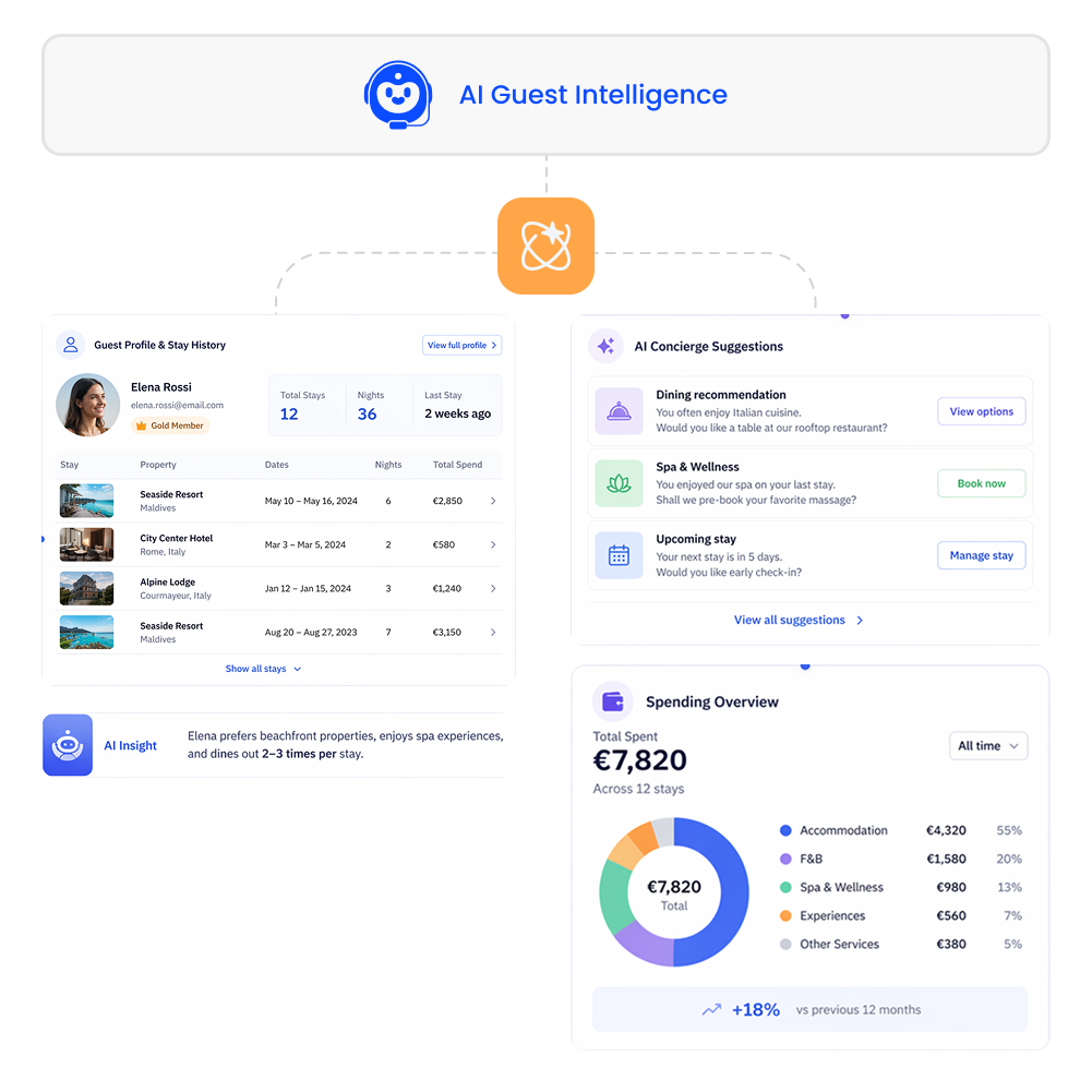 Gain total visibility into stay history and spending to anticipate needs with proactive AI-driven concierge suggestions.