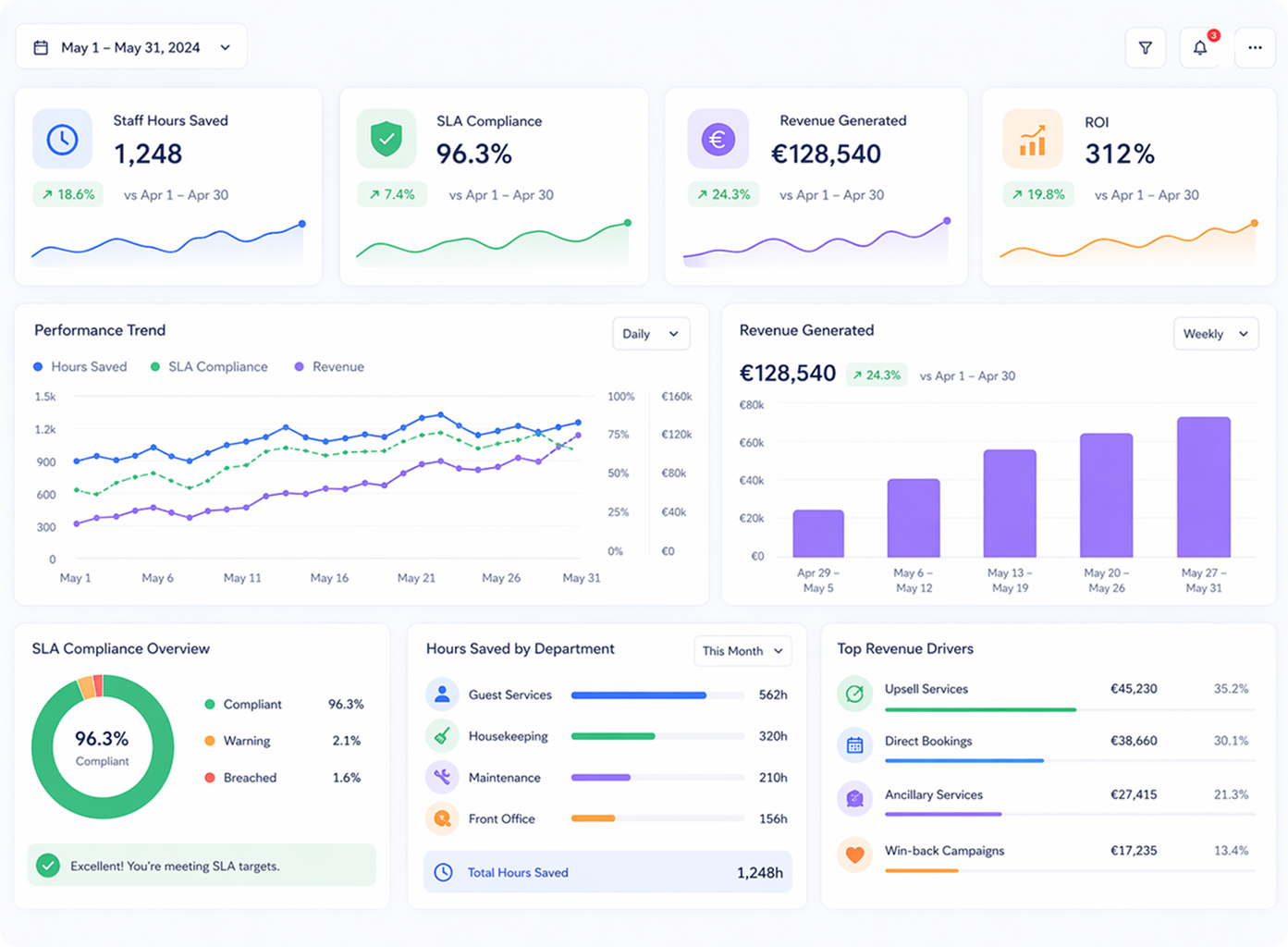 Gain full oversight tracking staff hours saved, SLA compliance, and revenue generated through a unified executive panel.
