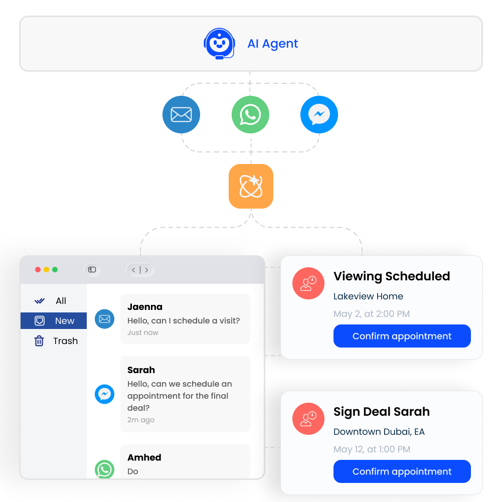Works with WhatsApp, websites, and real estate portals to centralize communications.